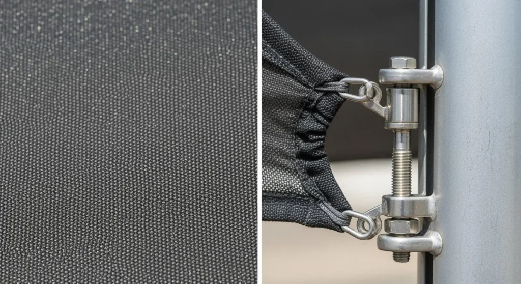 Le choix du matériau est important pour garantir la solidité et le look de la voile. Le polyéthylène haute densité (HDPE) est souvent utilisé car il résiste bien aux UV, au vent et à la pluie fine, tout en étant facile à entretenir et offrant une bonne aération.