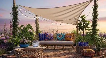 - Salon de détente ombragé : Combinez un ou deux voiles douces au-dessus d’un salon de jardin avec canapés et fauteuils. Jouez sur les hauteurs pour une ambiance cocon, ajoutez des leds pour la soirée.