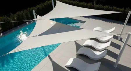 - Piscine chic : Superposez des voiles triangulaires au-dessus du bassin pour de l&’ombre en journée et une touche élégante. Utilisez des matières résistantes au chlore et optez pour des couleurs claires pour la fraîcheur.