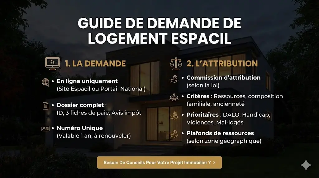 La demande de logement social se fait exclusivement en ligne sur le site web d’Espacil Habitat ou via le portail national de la demande de logement social. Le formulaire recueille les informations sur la situation familiale, professionnelle et financière du demandeur.