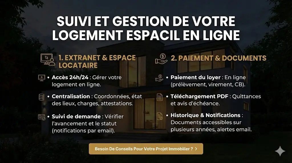 Espacil met à disposition un extranet permettant aux locataires de gérer leur logement 24h/24. L’accès se fait via identifiant et mot de passe fournis lors de la signature du bail. En cas d’oubli du mot de passe, une procédure de récupération est disponible en ligne.